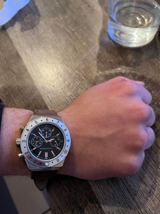 Reloj de pulsera con un diseño moderno y llamativo. - Correa de silicona azul. - Bisel giratorio azul con marcadores plateados. - Esfera oscura con detalles plateados.