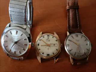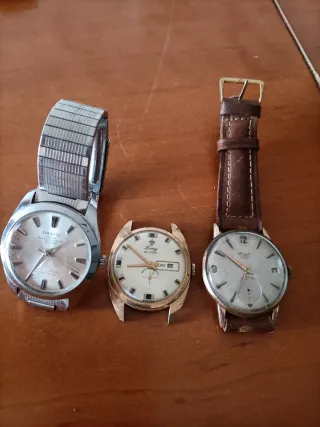 Conjunto de tres relojes de pulsera. - Reloj Omatic con correa metálica. - Reloj con correa de cuero marrón y detalles dorados. - Reloj con caja dorada y correa de cuero.