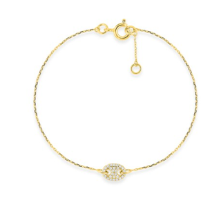 Pulsera de oro amarillo 9K, adornada con un motivo central en forma de grano de café, enteramente pavimentado con circonitas blancas relucientes. Con una longitud de 18 cm y un anillo intermedio a 16,5 cm, esta pulsera presenta un peso medio de oro de 0,80 g, ofreciendo ligereza y comodidad diaria. Su cierre reasa asegura un cierre seguro y fiable.