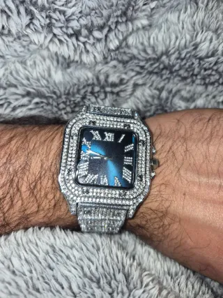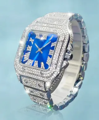 Se vende con su caja y todo. Elegante reloj con esfera azul y detalles en oro blanco, adornado con diamantes. - Bisel y pulsera cubiertos de brillantes. - Diseño de lujo. - Esfera con números romanos. (Precio No Negociable)