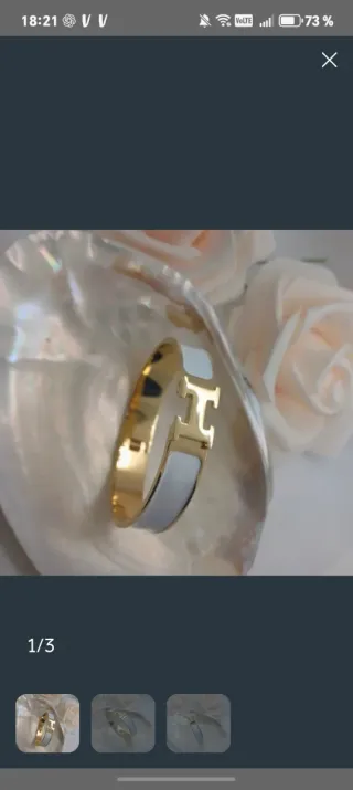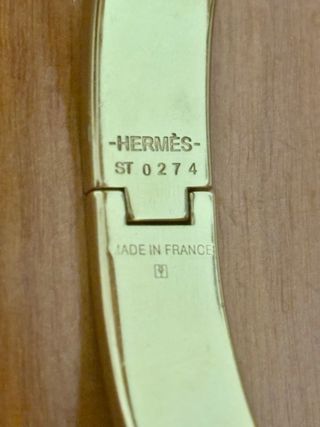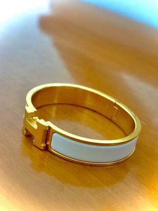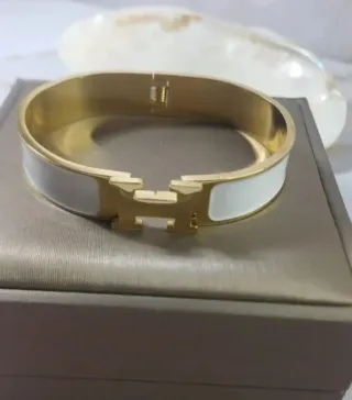 Elegante pulsera o brazalete original de la reconocida marca Hermes. - Diseño icónico con la letra H. - Combinación de oro y esmalte blanco.