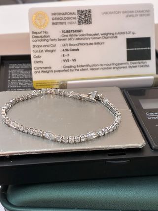 Elegante pulsera tenis de oro Blanco de 14 quilates con 4.96 quilates en diamantes, certificada por IGI.(lab-report) - Diseño clásico y atemporal. - Diamantes engastados para máximo brillo. - Certificado IGI incluido. -peso total 5.31 gramos -largo 17.5 Cm -Total de diamantes 47 Esta pulsera es una melodia explosiva de brillos y destellos ,es preciosa , Allá donde vayas no pasaras desapercibida Ver fotos por favor Se envia en su estuche y su certificado GRACIAS M.V🦋🖤