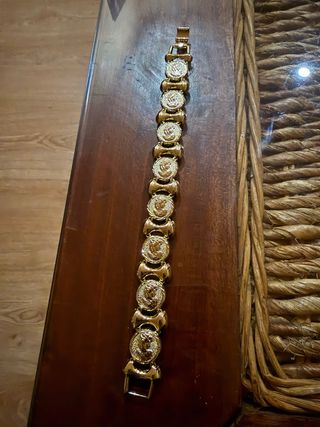 Elegante pulsera con eslabones en forma de monedas, con un acabado laminado en oro. 20cm. Pieza comprada en joyeria. precioso pulsera de acero laminado en oro de 14K. Lleva tres capas de oro laminado por lo que no perderá el brillo ni cambia de color. talla 20 cm. Una vez que pruebes la calidad del oro laimiando no querrás volver a gastar tanto dinero en oro. - Diseño con monedas. - Acabado laminado en oro.