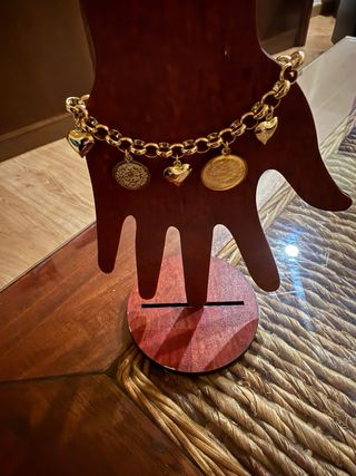 Elegante pulsera con cadena de eslabones y varios dijes. - Dijes de monedas con diseño grabado. - Dijes con forma de corazón. - Fabricada en oro laminado de 14 quilates.