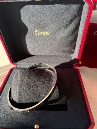 Pulsera para hombre original Cartier de oro blanco, modelo Love, talla 21 (XL) - Fabricada en oro blanco. - Diseño icónico de la marca. - Incluye certificado de compra tienda Passeig de Gracia Barcelona, caja original, estuche de viaje. - A estrenar, sin uso. - Comprada 31/7/2024 con tiquet a mi nombre, precio tienda Cartier 6.160€