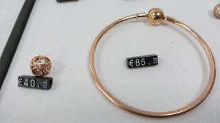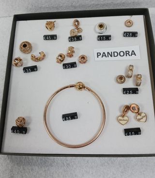 Pulsera Pandora y charms Pandora. Precio por unidad, detallado en las fotos. Consúltenos disponibilidad de cada pieza. - Pulsera rígida con cierre de bola. - Charms variados con diferentes diseños. - Material: aleación de metales con baño de oro rosa.