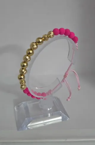 Elegante pulsera con un diseño moderno y llamativo. - Elaborada en oro de 18 quilates. - Combina cuentas doradas con acabado texturizado y cuentas rosas. - Cierre ajustable para mayor comodidad.