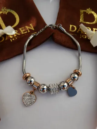 Pulsera de plata 925 con un diseño de dos corazones entrelazados. Uno de los corazones está bañado en oro rosa de 18K y el otro es de plata 925. - Plata 925. - Baño de oro rosa de 18K. Rango De Quilates: R1 Metal: PLATA Baño Metal: ORO_18K Color Metal: BIC_BLANCO_ROSA Material: PLATA BIC_BLANCO_ROSA Tipo Cierre: MOSQUETON Dimensiones: 180 mm x 11,7 mm Hay que hacerle una limpieza porque tiene una zonas pequeñas donde ya está algo oscura, por eso la vendo tan barata. En tienda se vende por 79€. Incluyo la bolsita original de aristocrazy para guardar la joya y una pulsera Tummy.
