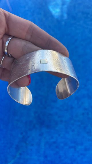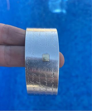 Precioso brazalete de la marca Rosa Bisbe, una pieza elegante y única. - Diseño grabado con escritura. - Detalle central en oro. - Materiales: plata y oro.