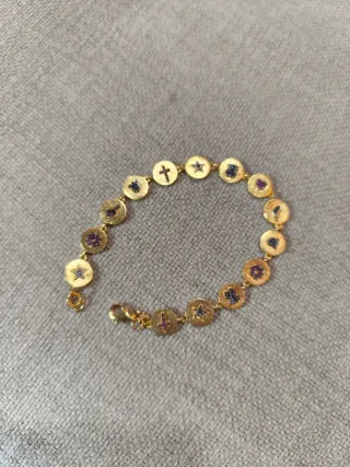 Pulsera elástica TOUS con gemas y pequeño colgante de la marca en oro 18 Kt. Oso central de Rodonita, resto de gemas son aguamarina, amatista, aventurina, calcedonia, citrino, cornalina, cuarcita, cuarzo mineral y turquesa Esta pulsera es única, el modelo original tiene el oso en plata. Esta lo tiene de oro 18 Kt. Se rompió el elástico (por eso hay dos gemas sobrantes) y solicite el cambio. Precio 75€ LAS FOTOS FORMAN PARTE DE LA DESCRIPCIÓN Puedes ampliar las imágenes o contactarme si tienes alguna pregunta; con gusto la respondere Empaquetado cuidadoso y envío rápido. Tu pedido se preparará con el máximo cuidado