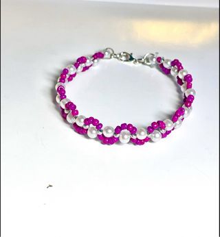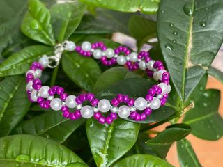 Pulsera hecha a mano con un diseño delicado y llamativo. - Combina perlas blancas y cuentas moradas. - Cierre plateado. - Diseño floral.