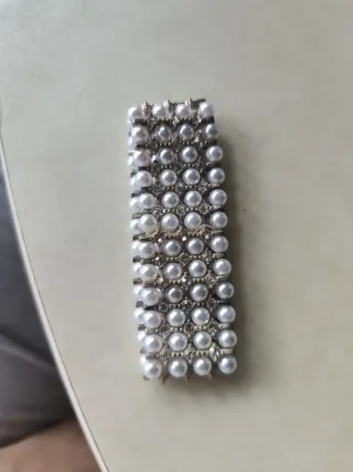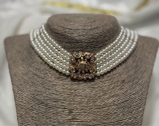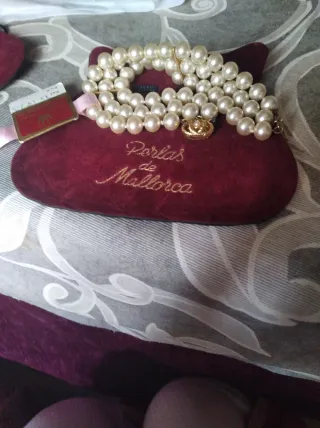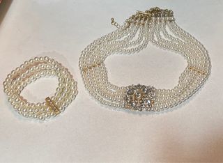 Conjunto de collar y pulsera de perlas de imitación, ideal para trajes de fallera o eventos especiales. - Diseño elegante con múltiples hilos de perlas. - Detalle central con pedrería brillante. - Cierre dorado. - Pulsera a juego con cierre de barra y pedrería.