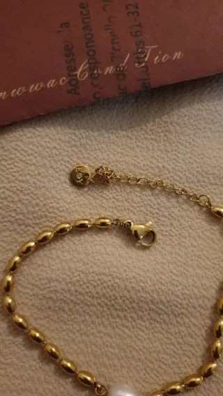 Elegante pulsera chapada en oro con un detalle de perla central. - Diseño con eslabones ovalados. - Cierre de mosquetón ajustable.