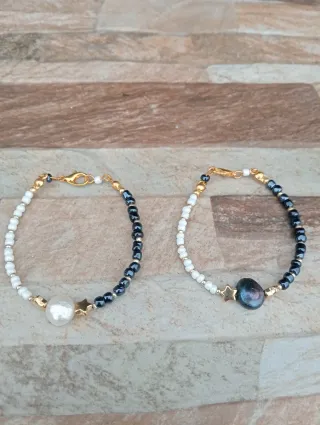 Conjunto de dos pulseras, ideales para parejas o amigos, con un diseño inspirado en el Yin-Yang. - Cuentan con cuentas blancas y negras, se cristal. - Incluyen un detalle de estrella dorada. - Cada pulsera tiene una perla central, una blanca y otra negra con lustre azul. -Cierre metálico de mosquetón.