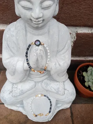 Conjunto de pulseras hechas a mano con cuentas. - Diseño con perlas blancas. - Cuentas circulares de color azul. - Detalle central con cuenta de ojo turco.