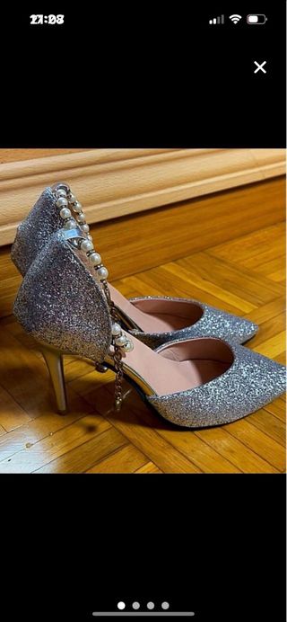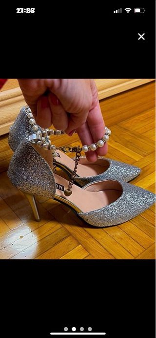 Elegantes zapatos de tacón con un acabado brillante y pulsera de perlas. Solo una puesta están nuevos.