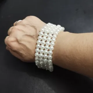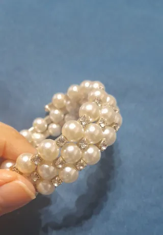 Elegante pulsera con un diseño de varias vueltas, adornada con perlas y detalles brillantes. - Perlas de color blanco. - Abalorios tipo diamante entre las perlas.