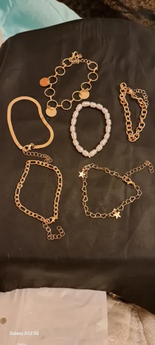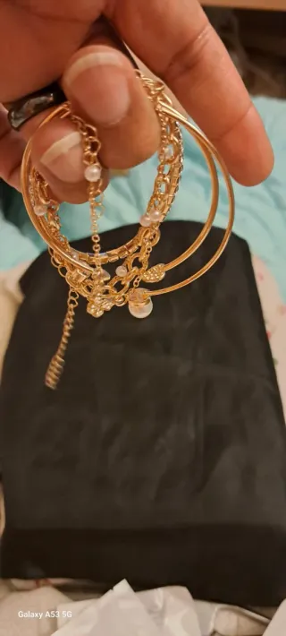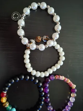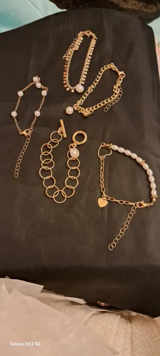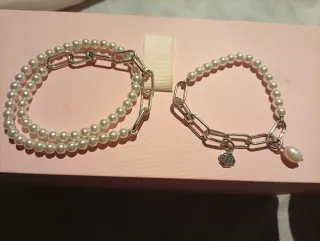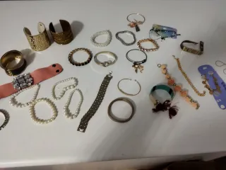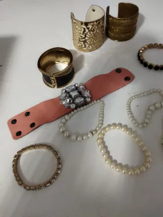 Conjunto de pulseras de diferentes estilos y diseños. - Pulseras tipo esclava. - Pulseras con perlas. - Pulseras con detalles. - Pulseras con cadena. Se venden por separado y el precio puede variar de uno a otro.