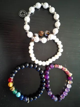 Lote de cuatro pulseras, cada una con un diseño único. - Pulseras con cuentas de perlas y detalles metálicos. - Pulsera con cuentas negras y detalles de colores. - Pulsera con cuentas moradas y detalles de colores. - Pulsera con cuentas de colores y detalles de conchas.