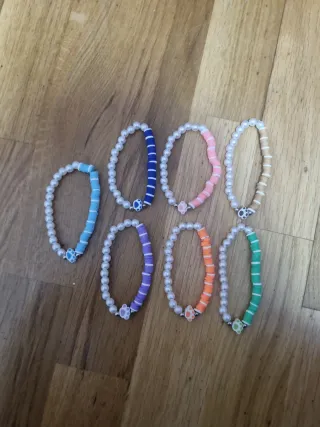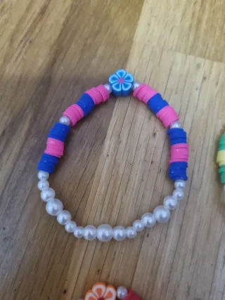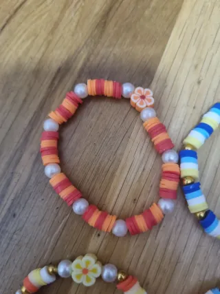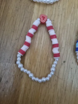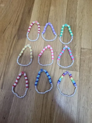Conjunto de pulseras hechas a mano con cuentas y un detalle de corazón. - Diseño colorido y divertido. - Cuentas de arcilla polimérica y perlas.