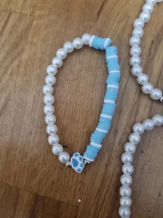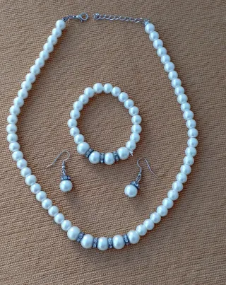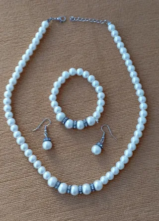 Elegante conjunto de bisutería con perlas y detalles plateados. - Incluye collar, pulsera y pendientes. - Diseño clásico con perlas. - Cierre de mosquetón en el collar. -Pulsera elástica