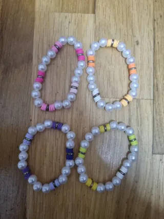 Conjunto de cuatro pulseras hechas a mano con cuentas de perlas y discos de colores. - Diseño único y llamativo. - Combinación de perlas blancas con discos en tonos rosa, naranja, morado y amarillo.