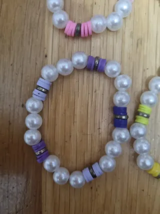 Conjunto de pulseras hechas a mano con cuentas de perlas y discos de colores. - Diseño único con abalorios. - Variedad de colores vibrantes. - Cierre seguro y ajustable.
