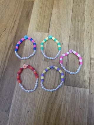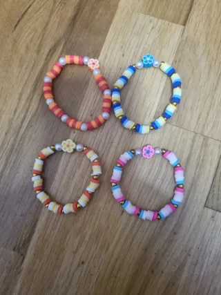 Conjunto de cuatro pulseras hechas a mano con cuentas de arcilla polimérica y perlas. - Diseño colorido y divertido. - Cuentas con forma de flor. - Adornos dorados.
