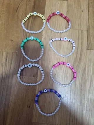 Conjunto de pulseras hechas a mano con cuentas. - Diseño con ojo turco. - Variedad de colores vibrantes. - Cuentas de perlas. - Estilo moderno y juvenil.