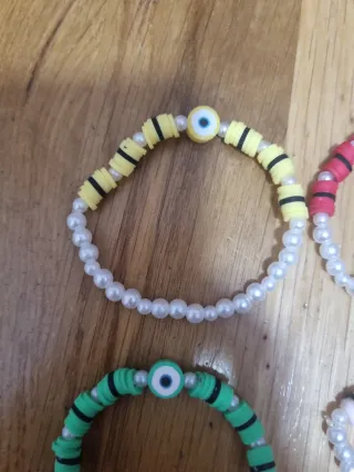 Conjunto de dos pulseras hechas a mano con cuentas de arcilla polimérica y perlas. - Diseño con cuentas de colores. - Cuentas con forma de ojo. - Perlas intercaladas.