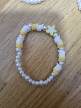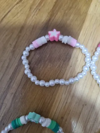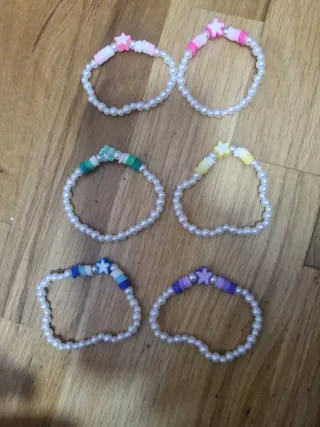 Conjunto de pulseras hechas a mano con cuentas de perlas y abalorios. - Diseño con cuentas de arcilla polimérica. - Adornos en forma de estrella. - Variedad de colores en los abalorios.