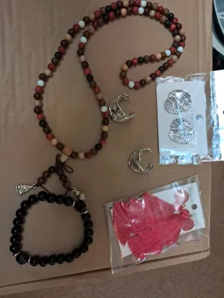 Conjunto de bisutería variado, ideal para complementar cualquier atuendo. - Pendientes dorados con forma de cruz y adornos de colores. - Pendientes perla blancos. - Pendientes dorados con perla. - Pulsera de cuentas en tonos burdeos y dorados. - Brazalete rígido naranja. - Peine decorativo rosa. 4,26€ unidad