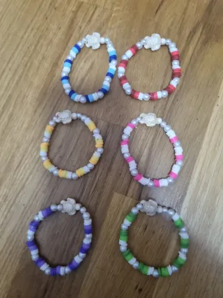 Conjunto de cinco pulseras hechas a mano, perfectas para añadir un toque de color. - Diseños variados con cuentas y adornos de flores. - Cuentas de perlas blancas en cada pulsera. - Combinaciones de colores vibrantes.