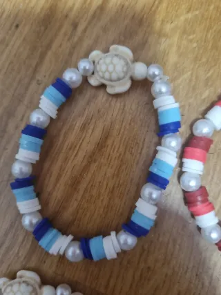 Conjunto de pulseras hechas a mano con cuentas de colores y perlas, cada una adornada con un charm de tortuga. - Diseño colorido y divertido. - Cuentas de arcilla polimérica. - Cierre elástico para mayor comodidad.