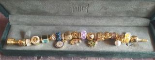 Pulsera estilo Pandora bañada en oro, con varios charms. - Diseño de eslabones dorados. - Incluye charms variados como un ojo turco, un trébol de cuatro hojas, y una perla. - Detalles en circonitas y esmalte de colores.