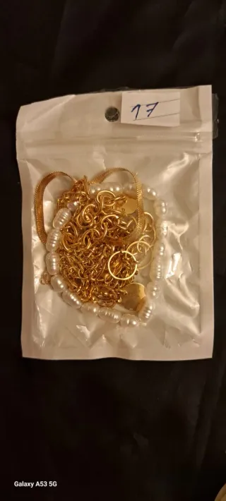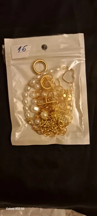 Conjunto de collares y pulseras de perlas, combinando tonos dorados y blancos. - Variedad de estilos y longitudes. - Cuentas de perlas de diferentes tamaños. - Algunos collares incluyen detalles adicionales como cuentas de turquesa o adornos plateados.
