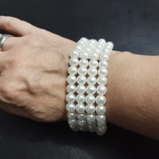 Conjunto de pulseras con perlas y cuentas de strass. - Diseño elegante y brillante. - Combina perlas blancas con cuentas plateadas y strass.