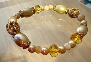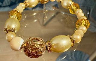 Elegante pulsera con una variedad de cuentas y adornos. - Cuentas ovaladas grandes con acabado perlado. - Cuentas redondas pequeñas. - Adornos esféricos dorados con diseño calado. - Cristales facetados en tonos amarillos y ámbar. - Pequeños detalles de pedrería en algunas uniones.