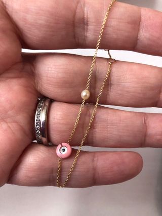 Elegante pulsera fina de oro 750. - Diseño delicado con una perla. - Detalle de ojo turco. - Cierre de mosquetón.