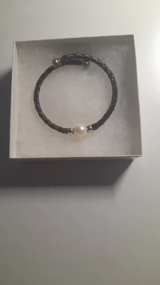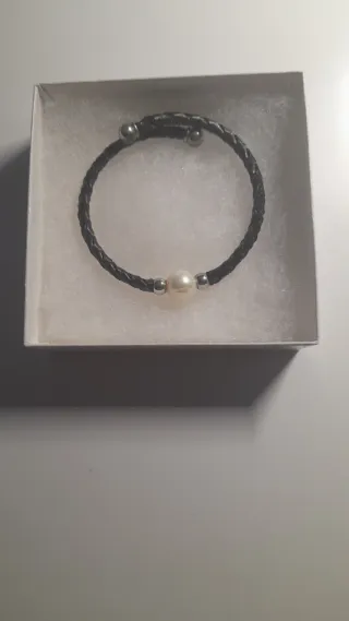 Elegante pulsera con un diseño trenzado y una perla central. - Pulsera de cuero negro. - Detalle de perla blanca. - Cierre con cuentas metálicas.