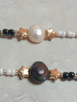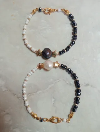 Conjunto de dos pulseras para mejores amig@s, cada una con un diseño único. - Una pulsera presenta una perla de tono oscuro y estrellas doradas. - La otra pulsera cuenta con una perla de tono claro y estrellas doradas. - Ambas pulseras están adornadas con cuentas pequeñas en blanco y negro, y detalles dorados. - Cierre de mosquetón metálico.