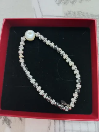 Pulsera de material Zamak. Cuenta con una perla central de color blanco. Medida de largo 18,70 cms. Nueva. Nunca se ha utilizado