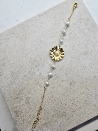 Pulsera dorada con flor y perlas