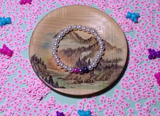 Bonita pulsera de perlas con un detalle central de piedra morada. - Perlas de color blanco. - Piedra central de color morado. - Incluye caja de regalo morada con lazo.