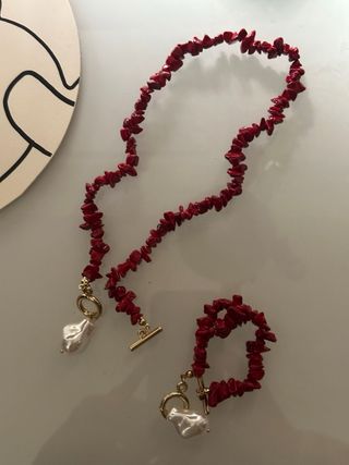 Conjunto de collar y pulsera con cuentas de coral rojo y detalles de perlas. - Cuentas de coral rojo. - Colgante de perla barroca. - Cierre tipo T. - Acabado dorado.
