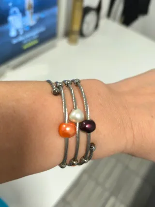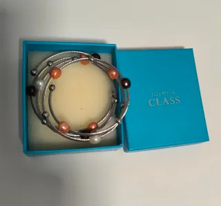 Elegante brazalete de la marca Joyería Class, con un diseño moderno y llamativo. -Brazalete de acero - Adornado con perlas de tonos naranja y detalles plateados. - Diseño en espiral que se adapta a la muñeca.
