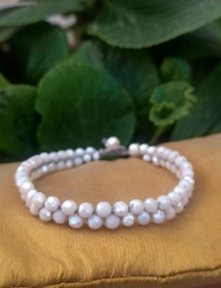 🌺 Pulsera de bisutería artesanal. Elaborada con dos filas de pequeñas cuentas facetadas de cristal en color 🎨 blanco nacarado y perlas naturales (perlas de río). 🏷️Cierre de "botón" con dos perlas para ajustar medida. 📐Longitud (incluyendo el gancho): 18,5 cm aprox. ❌ Libre de metales, ideal para evitar alergias ❌ 🩷NUEVA🩷 ▶️👁📐🔖compruebe siempre las medidas que vienen en la descripción del artículo. 🟣👉🏽más modelos en mi perfil👈🏽🟣