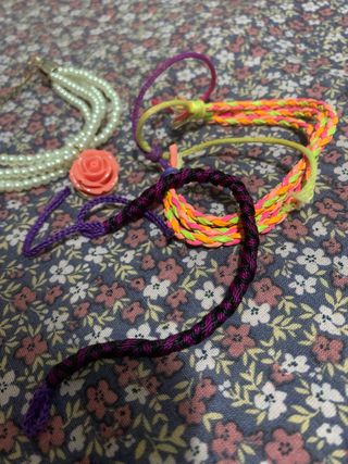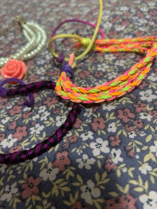 Conjunto de pulseras de hilo trenzado con un diseño colorido y juvenil. - Pulseras de varios colores vibrantes. - Cierre de nudo ajustable. - Diseño trenzado a mano. - Pulsera doble de perlas.