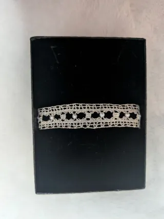 Elegante pulsera de estilo vintage, elaborada con un delicado tejido de encaje y adornada con pequeñas perlas. - Diseño de encaje intrincado. - Abalorios de perlas incrustados. - Cierre metálico plateado.