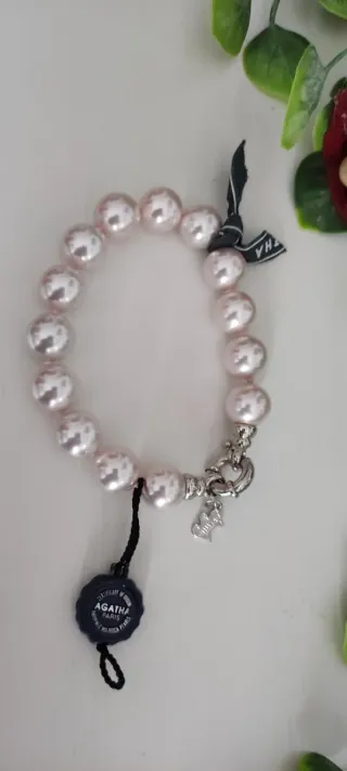 Elegante pulsera con perlas de un suave tono rosado y detalles plateados.